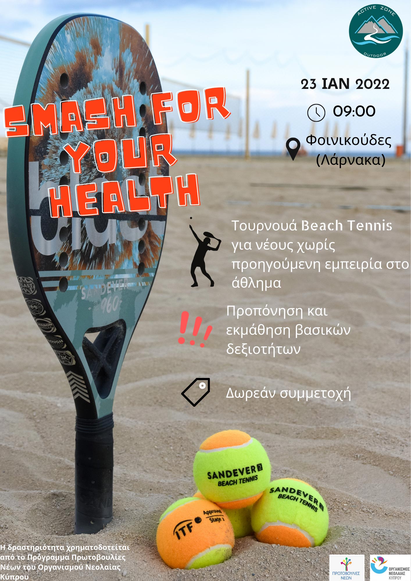 Acknowledging that beach tennis is becoming a powerful mechanism for social integration, socializing as well as enhancing the mental health and well-being of young people (e.g. reduction of stress levels), the project "Smash for your health" aims at introducing youth to the sport of beach tennis. The activity, which is funded by the Youth Initiatives Program of the Youth Board of Cyprus, will take place on January, 30th 2022 at Phinikoudes beach in Larnaca.